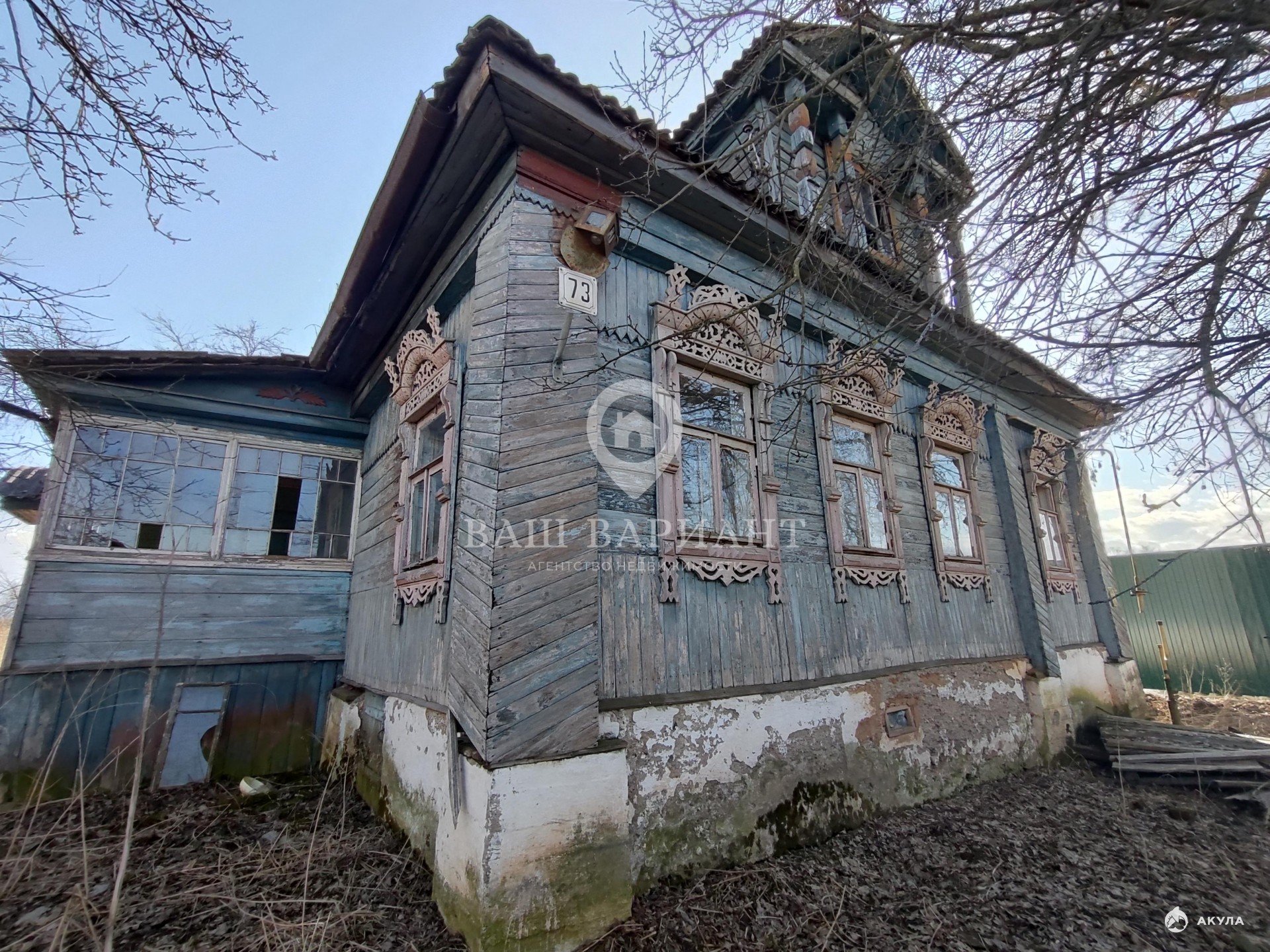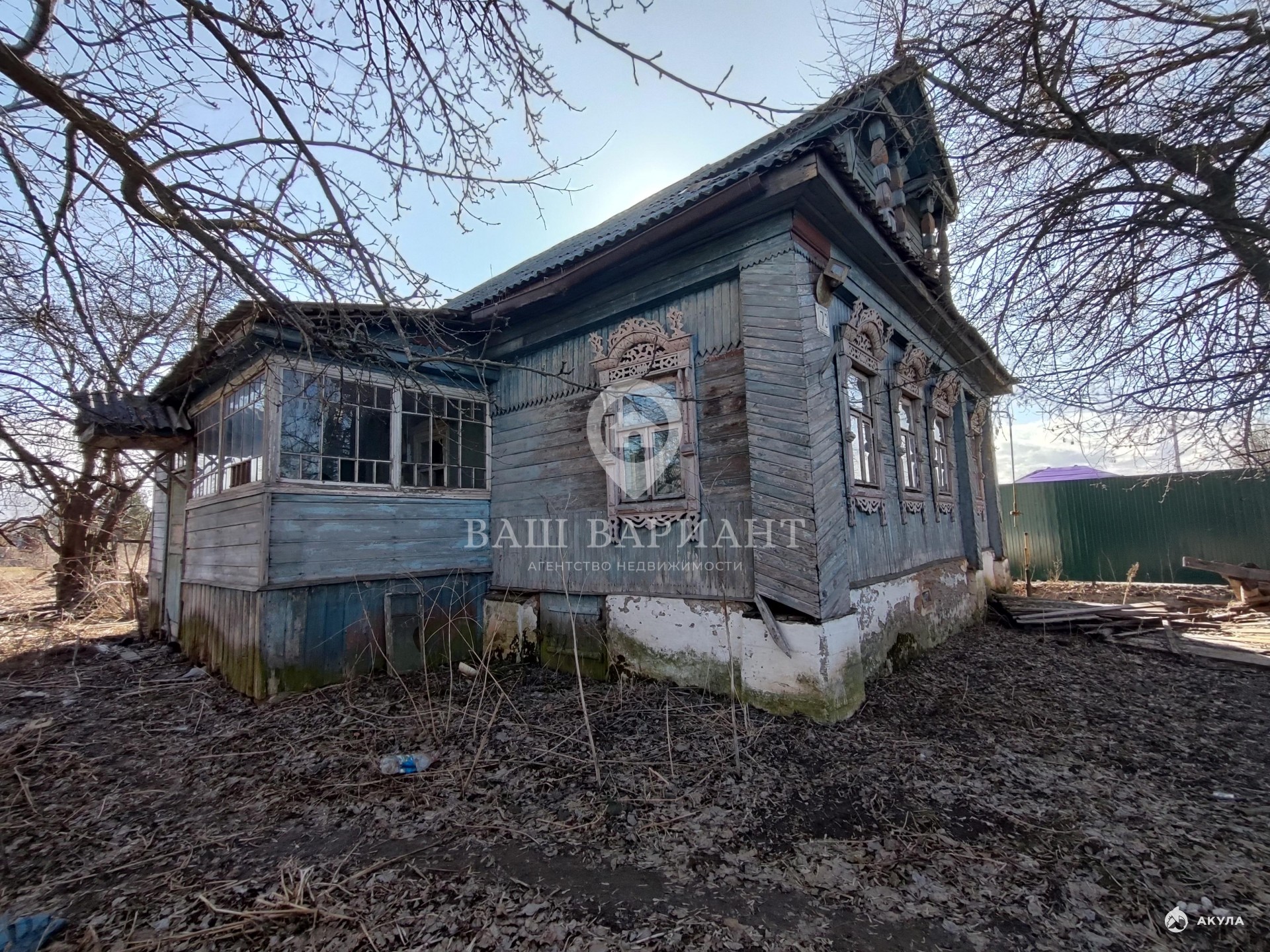 Бревенчатый, крыша шифер. Дом требует внимания к хоз пристройке и пол в доме. Есть колодец. Ухоженный участок правильной формы, высокий, сухой и ровный