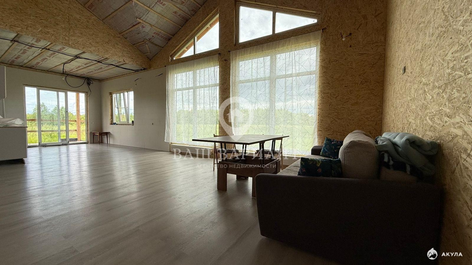 Кухня-гостиная оснащена панорамными окнами и вторым светом, есть выход на веранду и на участок. Потолки высотой 3 метра, в доме просторно и много места. Высота в коньке — 6 метров. Остекление выполнено фирмой Melke, по всему периметру установлен тёплый водяной пол.